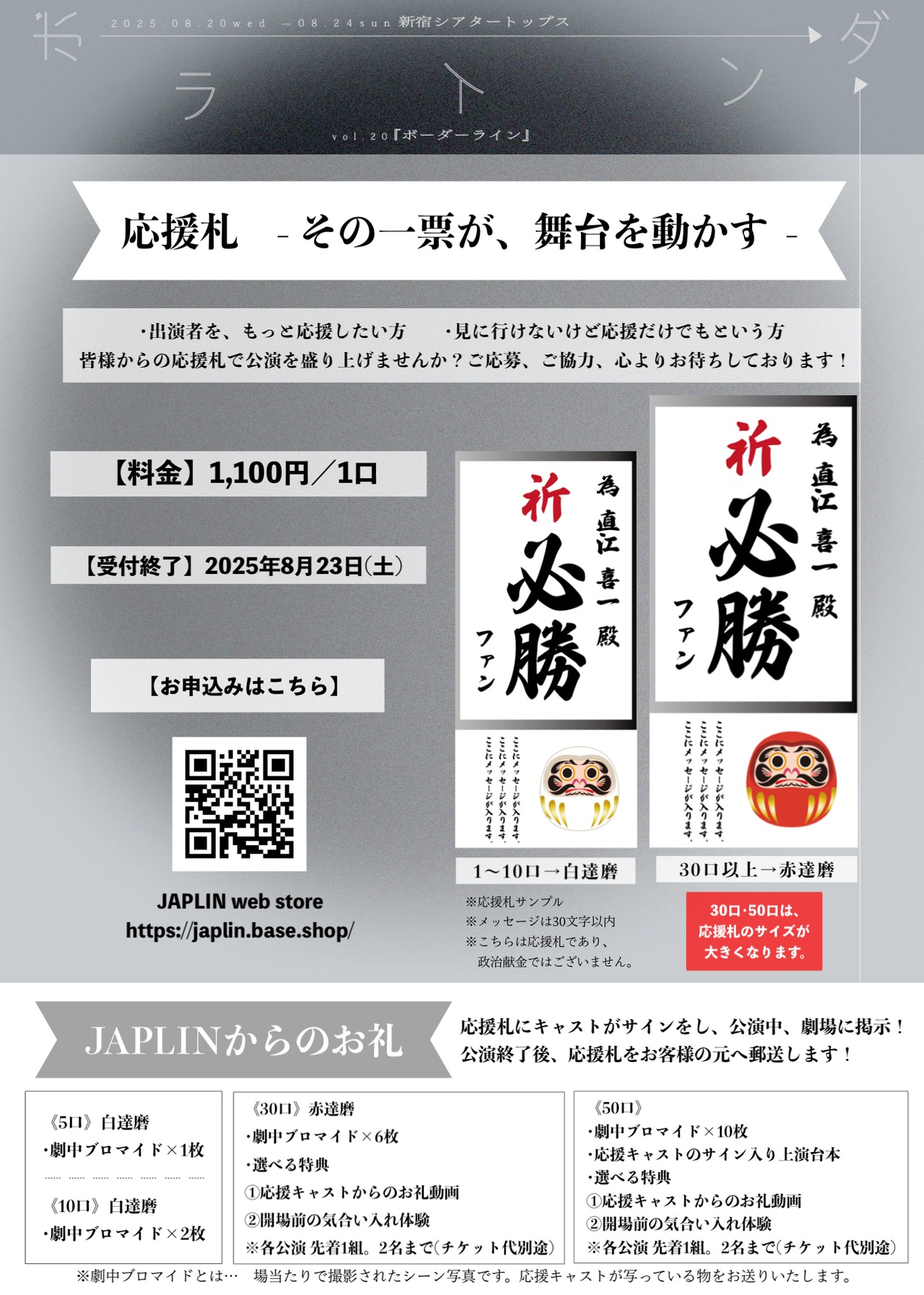 ・公演終了後、サイン入りの応援札をお客様の元へ郵送いたします。